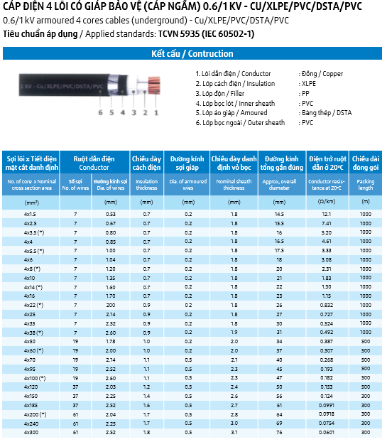 CÁP ĐIỆN 4 LÕI CÓ GIÁP BẢO VỆ (CÁP NGẦM) 0.6/1 KV - CU/XLPE/PVC/DSTA/PVC